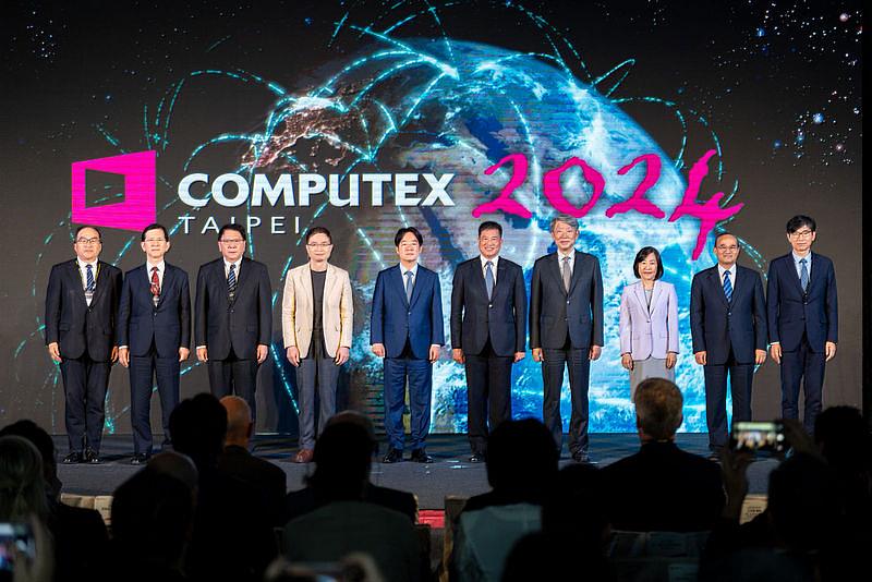COMPUTEX 2024開幕典禮由賴清德總統、總統府潘孟安秘書長、台北市電腦公會彭双浪理事長、中華民國對外貿易發展協會黃志芳董事長、經濟部郭智輝部長、數位發展部黃彥男部長等貴賓共同揭開序幕。